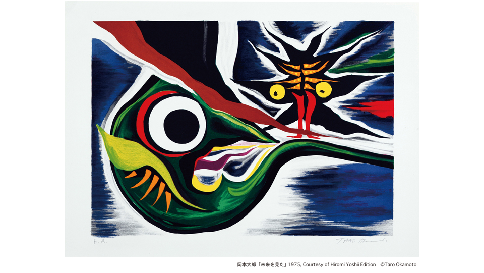 岡本太郎の根幹にあるこの思想を表したともいえる版画・プロダクト作品を、ぜひご高覧下さい。