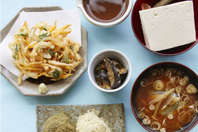 「d47食堂」に「富山定食」が登場します。d47食堂スタッフが富山を訪れ、名物や伝統料理を食べ歩き、富山湾に漁に出た末に考案したメニューです。白エビのかき揚げをメインに、高岡昆布飯、フクラギ(ブリの幼魚)のあら汁、旬の昆布〆、五箇山豆腐、郷土料理「よごし」など、オリジナルの富山料理をお楽しみください。すっきりと冴え渡る富山の地酒などと共に、美味しく味わっていただけます。