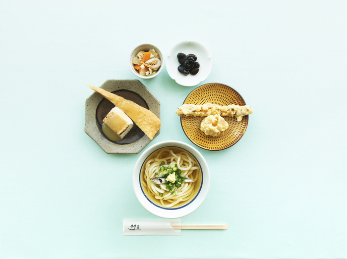 d47食堂スタッフが香川県を旅して、名物や伝統料理を食べ歩き、生産者に取材しながら「その土地らしい定食」を考えました。いりこの出汁の讃岐うどん、ひゃっかの雪花、しょうゆ豆、おでんの天ぷらなどの料理が登場する「香川定食」は、併設のd47食堂で、実際にご賞味いただけます。(写真:山﨑悠次)
