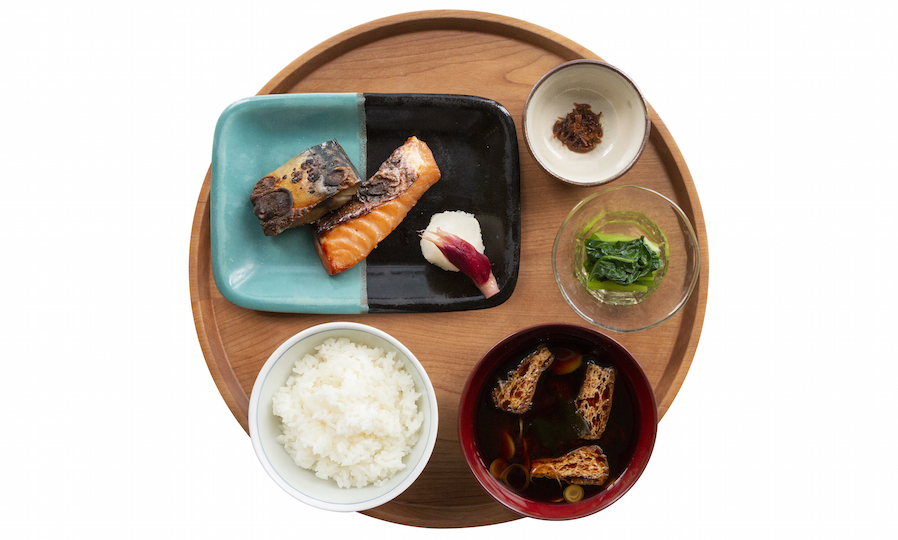 Fermentation Tourism Nippon 関連メニュー 旨味づくし定食 1,700円 石川県、能登に伝わる魚醤「いしる」に漬けたサバと秋田の「しょっつる」に漬けたサーモンを焼き魚で。たまり醤油で炊いたちりめん佃煮、白たまりのおひたし、八丁味噌のお味噌汁。醤油と味噌がたっぷり楽しめる。