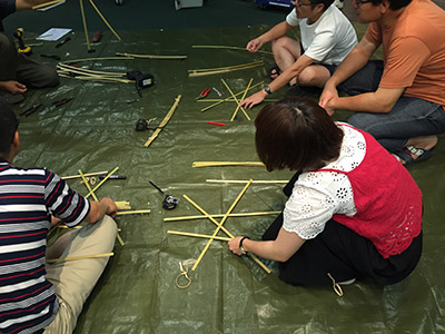 高橋さんの指導のもと、夢中でつくったスタードーム。これまでの構造を理解するために、60cmのヒゴを使って、直径40㎝、高さ20㎝のミニチュアドームをつくりながら総復習しました。2度目の作業とはいえ、プロセス4の組み合わせ方が難しい様子。完成後、解体して持ち帰ることもできますが、解体するのがもったいない…という方がほとんどでした。