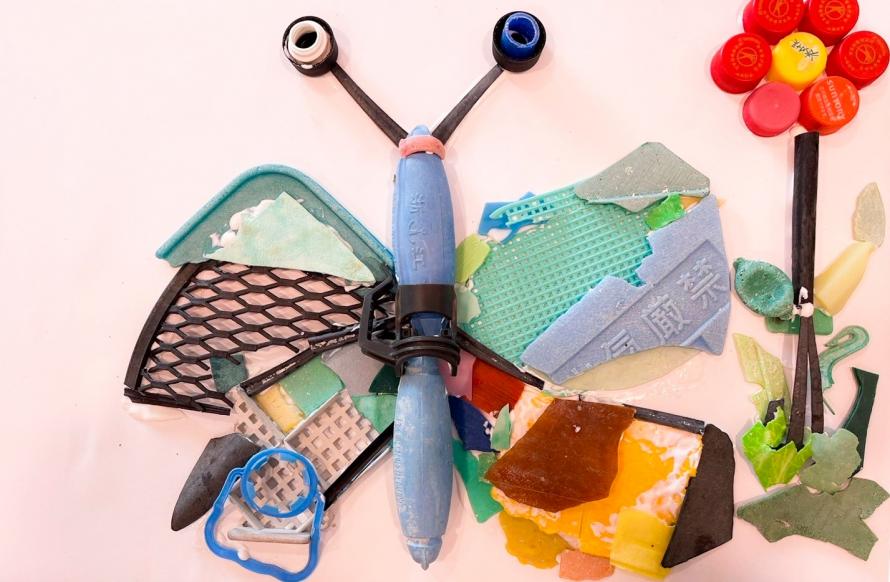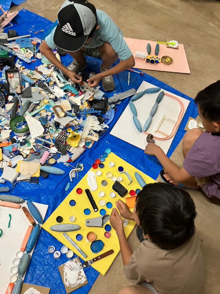 海に漂着した海洋プラスチックごみの素材を、あえて粉砕せずに、そのままのカタチを活かして。それぞれが自由な発想で、真っ白なキャンバスに海洋プラスチックを貼り付け、自分だけにしか作れない、オリジナルアート作品を完成させよう。