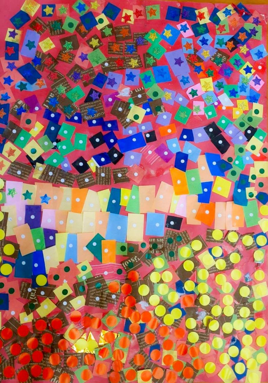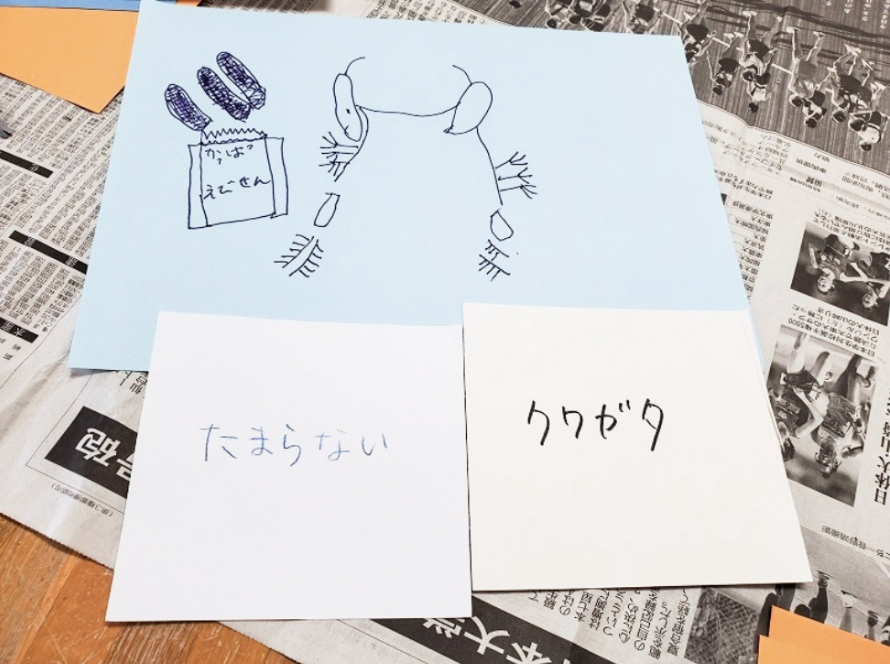 マラカスで絵を描く。左足で書道を書く。シールをペタペタ貼って大作をつくる。