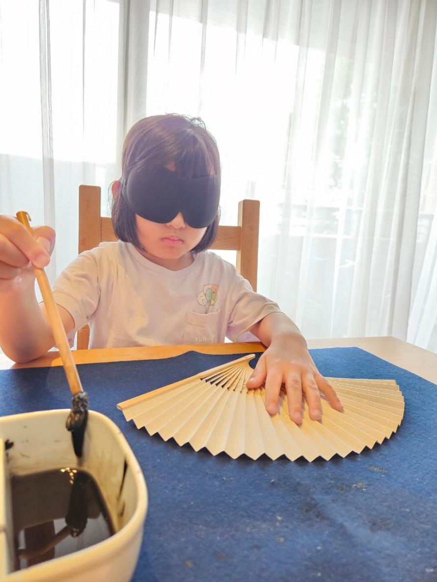 アイマスクを着けて「見ず」に書道作品を作りましょう。団扇や扇子等、様々なかたちのものを手探りで見つけながら、見える人も見えない人も、文字でもそうではなくても、筆の感覚を楽しみながら、みんなで楽しく書きましょう。