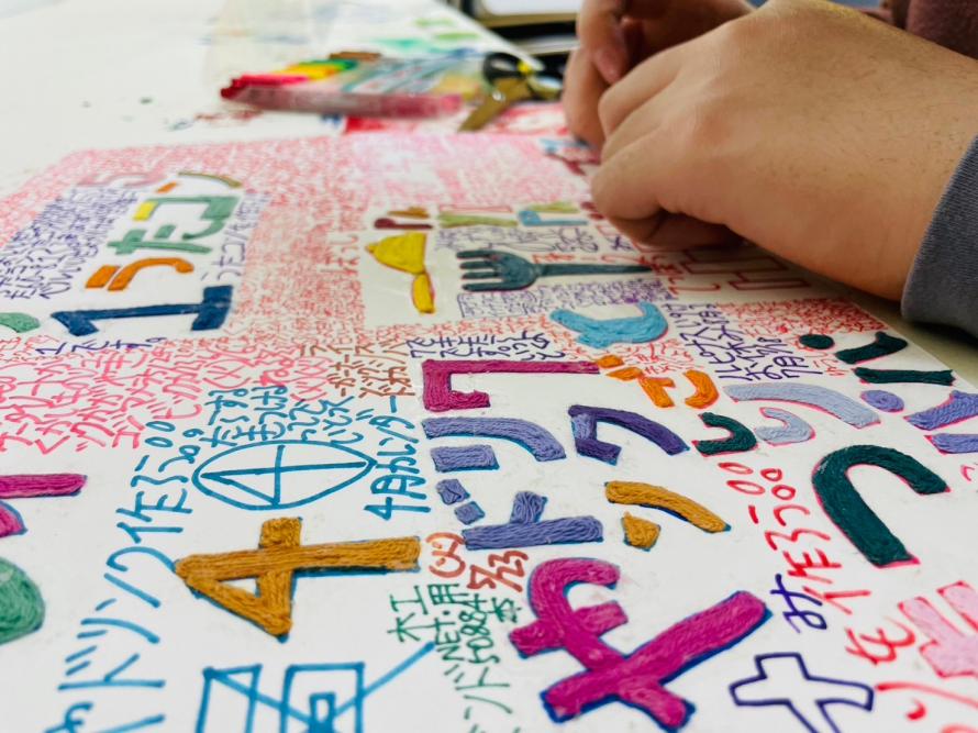頭の中に溢れる記憶に残っている言葉やイメージを書き留めるかのように、たくさんの文字やイラストをマーカーで描く。そして、描いた線で囲まれたスペースに所々色を塗るようにして、刺繍糸をカットしてはボンドで貼り付け埋めていく。この手法を発明したのは、9歳から音楽療法UNICOに通うKOTAさん。みなさんもKOTAさんと同じように好きな文字やイラストを描いたら、その一部に糸を貼ってみましょう。根気はいるけれど、一度やり出したらやめられない!?あなたもこの手法にはまってしまうかもしれません。