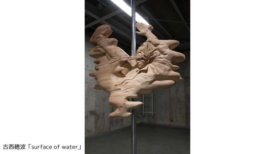 古西穂波は木の持つ偶性やモチーフ(主に自己に関する女性像)を可視化する際に、見える量や認識できる範囲をあえて限定する事や、作品化する時間とプロセスの中で現象性やレイヤーを通して見えるであろう歪みやバグを必要な要素と捉え、水中での見え方の歪みやエアーパッキンに包まれた作品の要素も積極的に取り込んでいく。彫刻の設えにおける合理性や素材性も意識的に行っているところも見逃せない。彼女にとって、木を彫り、制作すること、着色すること、単管を組み合わせて支持体をつくる行為は、彫刻作品をつくるという意思の同義性を表している。作品化する領域がつくられた場所と素材に戻す場所とを同居させることは非常に興味深い表現である。