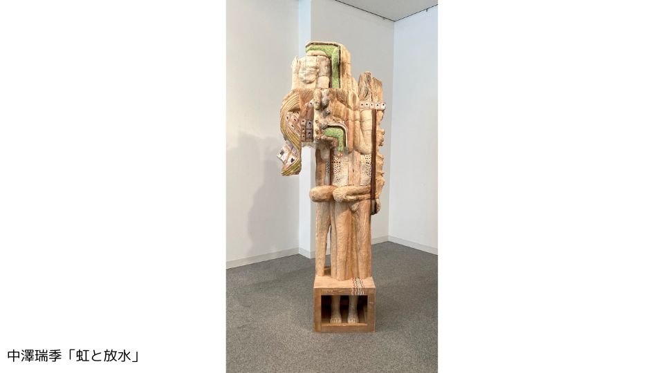 中澤瑞季の作品はある種のトーテム的なニュアンスと身体に関わるイメージを繰り返し現し、それらも構成要素として取り込みながら縦軸や横軸を意識的に構造化する事を効果的に行っている。それは著しく建築的でもあるが同時に彫刻としての垂直、水平という意識も強く感じさせる。カットアップとリミックスを繰り返しながら、それらを分散させる事なく、強固な構造性の中に封じ込めようとしているかのようだ。これらの問題意識がより彫刻的な存在を獲得してると言えるだろう。そして、韻を踏むという手法を彫刻表現に取り込んでいる点も興味深い。これらの要素により、視覚性や思考性を刺激するインパクトのある表現形態を獲得し、現代文学に作用させるロジックも同時に想起させる。彼女はブライオン・ガイシンやバロウズの存在もリスペクトしてるのだろうか。