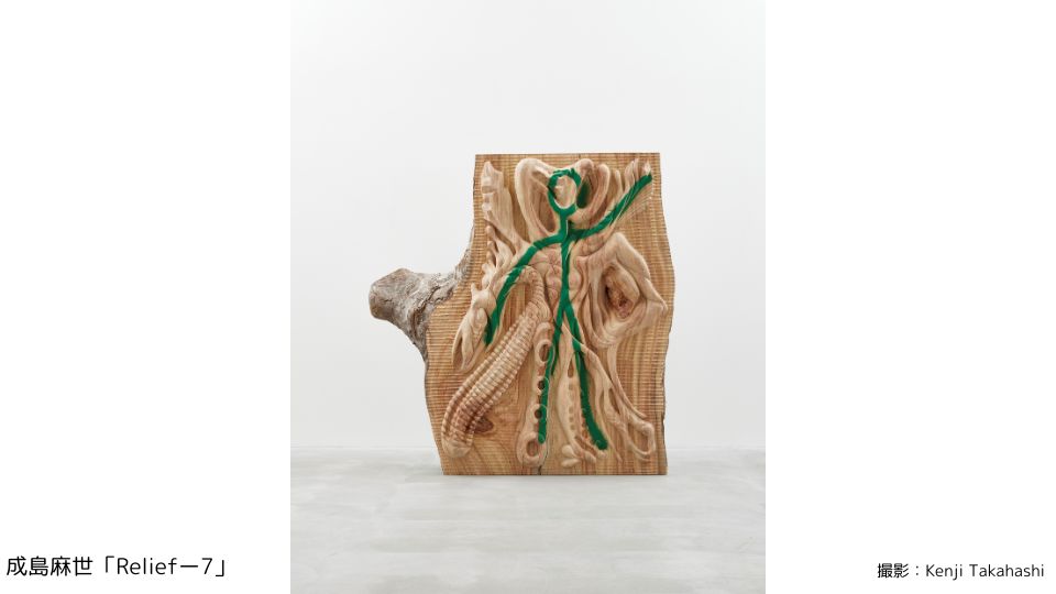 成島麻世は樟の板材をあえて多用することにより、支持体と彫刻作品としての領域の関係性を、より増幅させようとしてるかのようだ。精緻に彫られ、変形を施した身体を感じさせる場所の最表面には岩絵の具のピグメントを用いて、実際には丁寧にトレースされているにもかかわらず、あえて即興的に見えるような単純化された人型が現され、木という物質性を得た身体性と表面的に描かれた身体性がよい塩梅の差違を生み、ある種の混乱が齎される。もう一方で、一つの支持体としての側面も同時に存在させていることも興味深い。そして、それらをあえて物化するような設えの方法も見どころの一つと言えるだろう。作品化することの要素を、あえて削ぎ落とすことにより、得るものの大きさを感じさせることも視野に入れているのかもしれない。