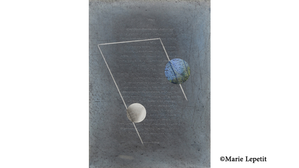 小さなドローイングからウォールペインティングまで、マリー・ルプティは星空のように広がる無限の領域を描きます。作品は繰り返し引かれた交差するラインで構成され、これらの交点が無数の星や幾何学的な星座のように現れます。色が光や大気を与え、幾何学模様が重なり合い、動きと奥行きをもたらすことで、作品の中に宇宙のような空間が静かに広がります。鉛筆で描かれたドローイングとノートブックのシリーズでは、ダンテの『神曲』、E.E.カミングス、チェスワフ・ミウォシュなどの詩から選ばれたテキストが、夜空を背景にランダムに浮かび上がります。そして、遥か彼方から届くシグナルのように私達に語りかけます。Of earthly civilization, what shall we say ? (Tidings, Czeslaw Milosz)