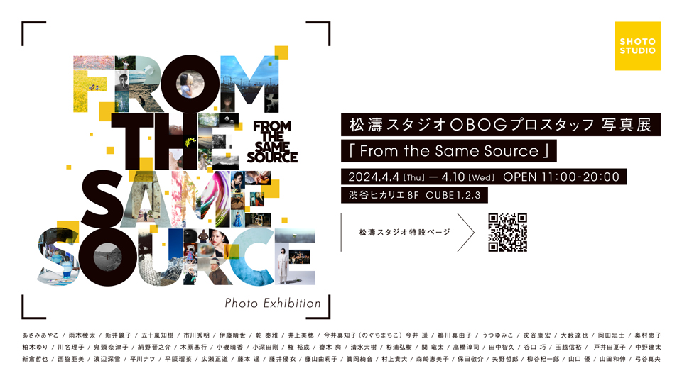 大型白ホリゾントレンタルスタジオとして様々な写真・映像撮影の空間とサービスを提供し、プロスタッフは「笑顔で、一所懸命、テキパキと」を社是に掲げ撮影をサポートしてます。フォトグラファーも数多く輩出し、いまは環境・仕事や世代も異なるOBOGと現役プロスタッフが、松濤スタジオをひとつの源としてコト・モノ・ヒト・セカイなどを通して、それぞれが感じてきた写真展です。