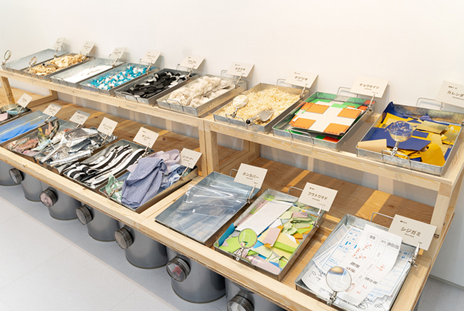 お隣のスペース「CUBE」でも、見方を変えることで新たな「気づき」や「面白さ」が発見できました。期間中現れたのが、本物さながらの回転寿司のカウンター。くるくる回るネタを近くで見ようと、来訪客が興味津々の様子で近づいています。そこに回っていたのは、工場などの製造過程で生み出される「ハザイ」を用いた「ハザイ寿司」です。