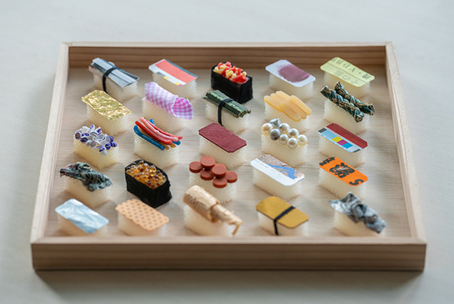 こちらは、サンプルとして展示されていた「ハザイ寿司」。玉子、鉄火巻き、マグロ、ウナギ、いくら…?。捨てられるはずハギレや紙屑が「ハザイ寿司」として生まれ変わると、紙や木屑、ゴムだったものが本物の「寿司」のように見えてきます。