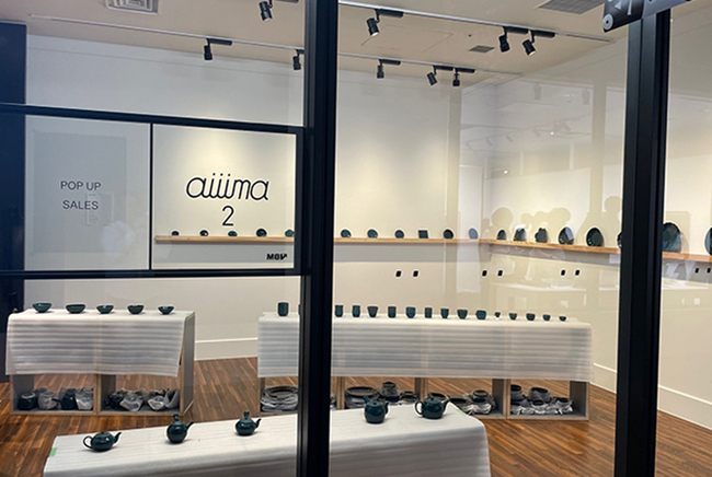 「Creative Lounge MOV」が運営するショーケース「aiiima(アイーーーマ)」では、『kiji arita exhibition』が開催されていました。”kiji”(生地)とは、絵付けや釉薬などが施されるまえの素焼きのもののことを指します。『kiji arita』は、産地の倉庫に眠る戦後から現代までに製造された有田焼の生地に着目し、新たな光を当て循環させて行くことを目的としたブランドプロジェクトです。有田焼」と聞くと、赤や藍などで彩られた繊細で華やかな絵柄を思い浮かべますが、『kiji arita』では、製造された年代の違いによる形状の違いを楽しんでもらうため、表面を青緑、高台部分に白磁を残す、1つの配色のみで展開し、製品裏に形状がデザインされた年代とロゴを配しています。このほかにも、まだまだたくさんの企画と展示、そしてワークショップが開催されていました。