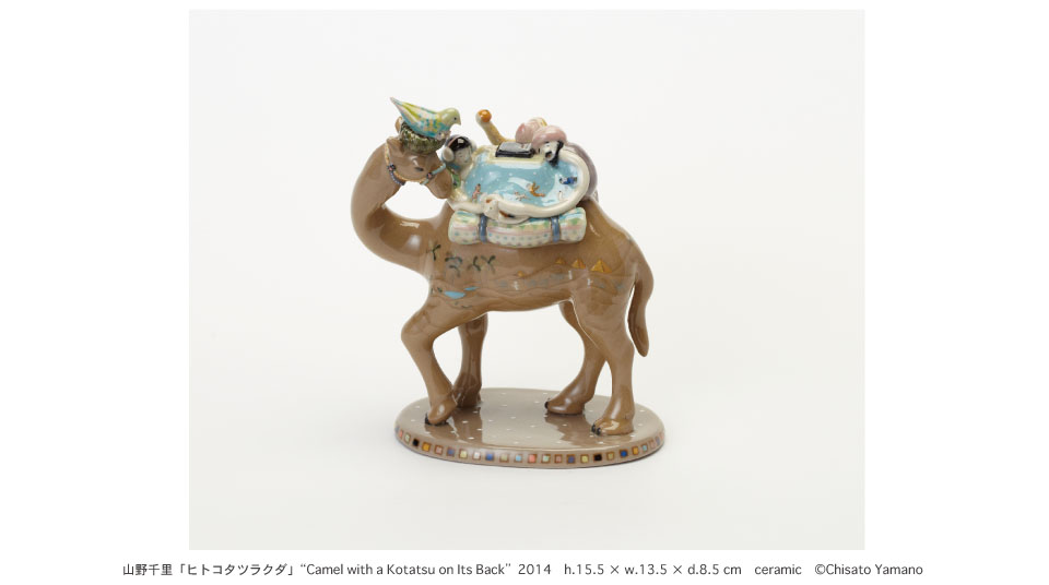 In Chisato Yamano’s ceramic works is a boundless imaginative power expands from fragments of memory and images, and stories that unfurl like word games. Humps of a camel turn into a kotatsu, and on top of it people start to play othello. Such numerous humorous stories are formed into different shapes through the movement of Yamano’s fingers, as if the people and animals mingle and live with each other delightfully in harmony. This exhibition is entitled “World Blend”. The artist says, “To think about what to mix and how to mix it within my art has something in common with making a flavor of blend coffee, which requires thinking about the characteristics kept in each variety of coffee bean originating from all over the world.”