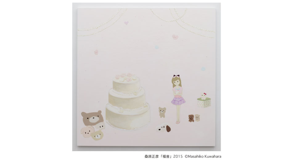 しかし90年代後半から、彼の絵画はそうした社会的言説性から徐々に遠ざかり、眼差しはよりプライベートな、内面の方に注がれるようになったようです。花やクラゲ、人形のようなモチーフが遠近なく乳白色の中に浮かび、そこには独特の体温、気だるい温もりが漂います。そして、雑誌や広告上で日々消費される無名の女の子たちのイメージが、頻繁にあらわれる頃から、それまでの桑原の絵画に支配的だった粘着的な重さは、軽妙さにとって代わられ始めます。近作の明るい画面には、そこはかとない寂寥感と表裏一体の不思議な多幸感が満ち、女の子のイメージは、どことなく聖母とも重なります。本展覧会では、2012年の個展以降に制作された新作を展示します。