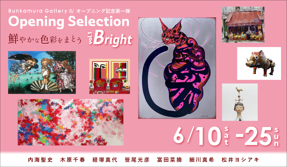 そしてBunkamura Gallery 8/ オープニング記念企画の第一弾として、「Opening Selection -Bright,Calm,Dark-」を開催します。これまでにBunkamura Gallery で個展やグループ展を開催した話題のアーティストたち、さらには今後活躍が期待される注目作家まで、Bright、Calm、Dark のカラーをイメージしそれぞれ3 会期にわたりセレクションしました。鮮やかな色彩をまとうBright、静の中に躍動するCalm、背徳的な美学を追及するDark。総勢20名のアーティストの最新作を中心にご紹介します。オープニングを飾るにふさわしいBunkamura Gallery ならではの特別なセレクションをお見逃しなく。