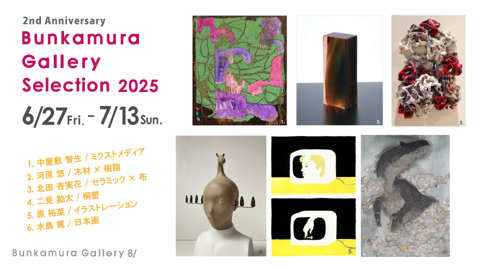 そして3年目に突入する今、開催するのは5回目の恒例開催となります「Bunkamura Gallery Selection 2025」。作家と鑑賞者を繋ぐ私たちスタッフが「今ご紹介したいアーティスト6名」を、それぞれの視点とこれまで培った感性で選出しました。木材×樹脂、陶磁器×繊維など異なる素材が絡み合う立体作品や、独自の色彩感覚が生み出す色鮮やかな抽象画、太古の神秘と浪漫あふれる恐竜日本画など、あたたかみある作品からシュールでユーモラスな世界観の作品まで一堂に揃います。