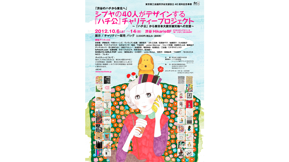 東京商工会議所渋谷支部は今年、支部設立40周年を迎えます。その記念事業として、多彩な才能が集い、新たな文化を発信し続ける街・渋谷ならではの東日本大震災被災地の復興支援として「『ハチ公』チャリティープロジェクト」を実施しております。プロジェクトでは、代官山生まれのトートバッグ専門ブランド「ROOTOTE(ルートート)」とのコラボレーションで、渋谷にゆかりのある40人のクリエイターによる「忠犬ハチ公」がモチーフのアートワークをのせたチャリティートートバッグを今秋より発売。その収益を東日本大震災被災地への支援活動に役立ててまいります。