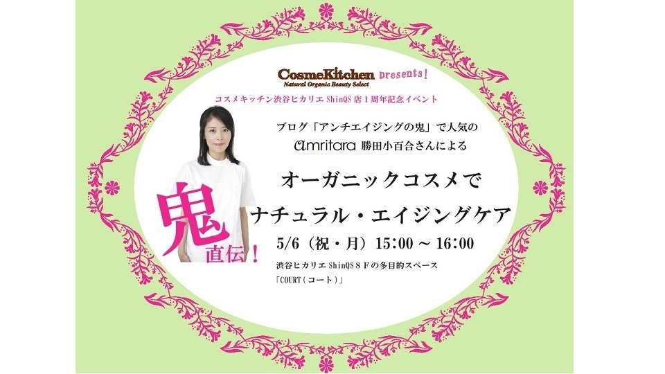 イベントでは、ブログ「アンチエイジングの鬼」で大人気の勝田小百合氏が独自の厳しい基準で開発している国産オーガニックコスメ「AMRITARA (アムリターラ)」を使用したエイジングケアの方法を伝授します。