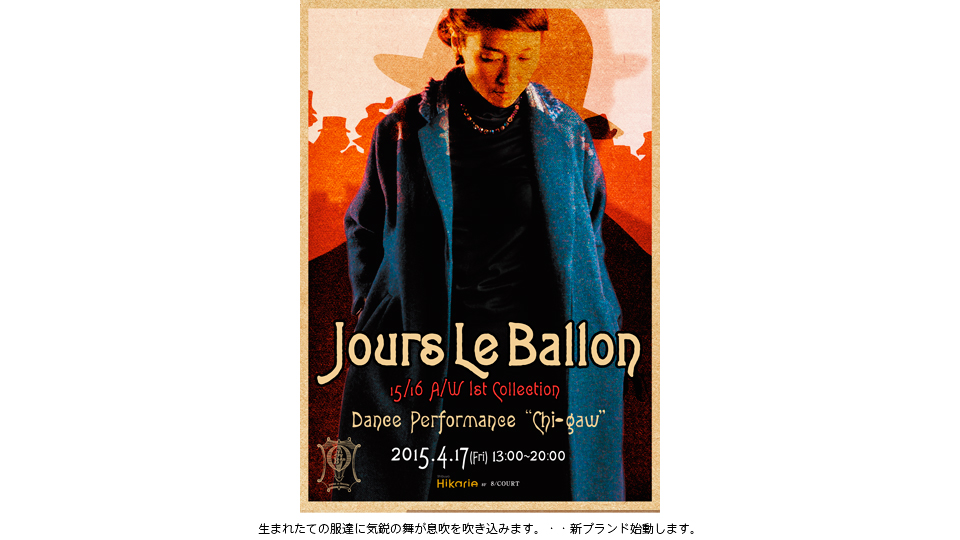 '15/'16 A/W Collectionよりデビューする新ブランドJours Le Ballonの新作発表会に伴う、コンテンポラリーダンスとの融合による新感覚展示会です。 −Jours Le Ballon-“男前なレディはいかが”をキャッチフレーズに架空の仕立て屋「ジュール・バロン」が贈る、不変のアイテムに流行とデザイン性の高さを加え、メンズファッションのシルエットからインスパイアされる美を追求したその女(ひと)らしい個性を演出するブランドです。加えて、今シーズンのテーマにもなっている、ベルエポックのパリを思わせる舞台を、ダンス、音楽、映像を交えて、コレオグラファー、亀谷遊香が一夜限りのエンターテインメントとしてお贈りします。全ての人が叫びたい、それぞれの「Chi-gaw(チガウ!)」をあなたの代わりに演舞します!