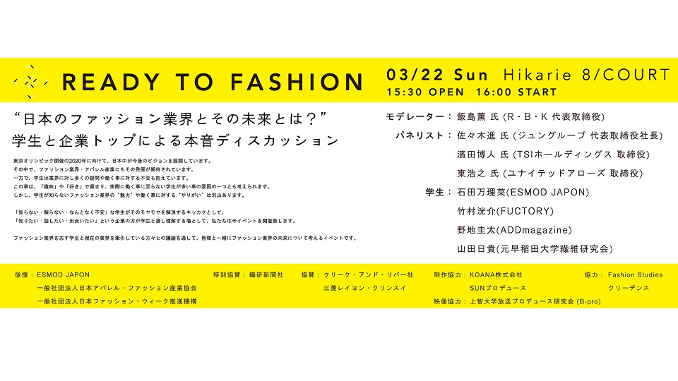 今回のイベントはREADY TO FASHION第0回という位置づけで開催し、「学生と産業を繋げる」というコンセプトを学生と企業の協働プログラム(長期インターンシップ、学生と企業によるチームプロジェクトの企画)として今後具現化する為の第一歩となる実験的な試みとします。