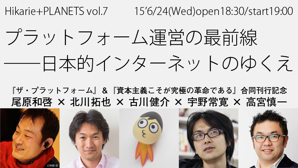2015年Kindleビジネス書年間7位のベストセラー『ITビジネスの原理』の著者であり6/11に『ザ・プラットフォーム』を出版する尾原和啓氏は、10回を超えるIT企業での転職から長きにわたり「IT」を見てきたプロフェッショナルだ。一方で6/10に出版される、PLANETS編集長・宇野常寛編著の対談集『資本主義こそが究極の革命である』からは、nanapi代表取締役社長の古川健介氏と楽天執行役員・北川拓也氏が参加。古川氏は81世代を代表する起業家であり、けんすう氏として鋭い分析と筆力でスタートアップ界に多大な影響力をもつインフルエンサーでもある。北川氏は理論物理学者でありながら、ECサイトは人間の意識を変容させることが可能かについて深い示唆を持つ。さらにITのビジネスモデル知り尽くすプロであり、資本主義の根幹を担うともいえる投資家、グロービスの高宮慎一氏を迎えた。司会はPLANETS編集長で評論家の宇野常寛がつとめる。