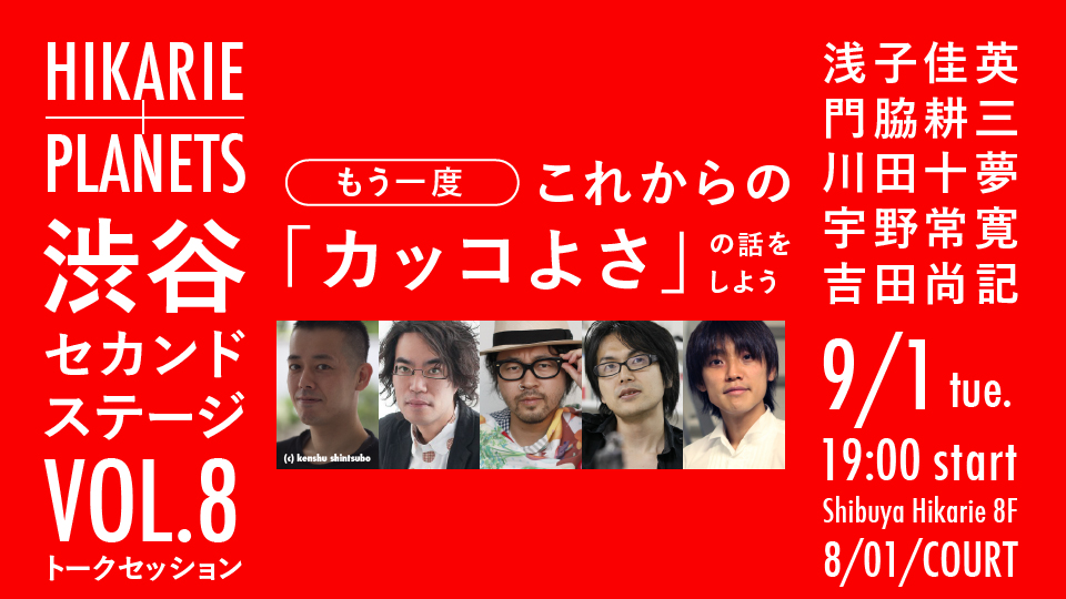 毎回100名を超える参加者で満席となる渋谷セカンドステージらしい出演者を今回も迎えました。門脇耕三氏は過去の文脈を読み解き、今あるべき建築を語れる稀有な建築学者。インテリアデザイナーの浅子佳英氏は自身でツアーを組むだど最新のショップデザインに精通し、建築とモノ(商品)の中間にあるべきインテリアデザインを語れるプロフェッショナルです。また、TBS「情熱大陸」などテレビやイベント出演のオファーが絶えないユニット「AR三兄弟」の長男である川田十夢氏は、既存の枠組みにとらわれない新しい発明やデザインを続ける今を代表するクリエイターです。以上の3名に本イベント主催のPLANETS編集長であり評論家の宇野常寛を加え、司会にはニッポン放送アナウンサーで「よっぴー」の愛称で親しまれる吉田尚記氏を迎えました。個人としてもカッコいいモノに対する独自のこだわりが強い5人が集い、もう一度、これからの「カッコよさ」について真剣に語り尽くします!