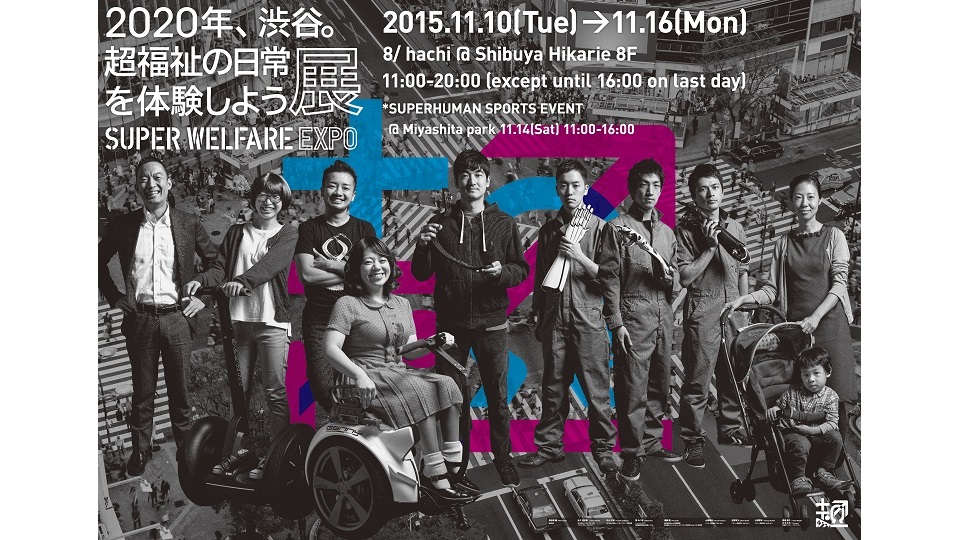 2020年、渋谷。超福祉の日常を体験しよう展SUPER WELFARE EXPO 会 期 2015年11月10日(火) - 2015年11月16日(月) 時 間 11:00 - 20:00 (※最終日は16:00まで) 場 所 COURT 料 金 無料 事前申込 不要 主 催 NPO法人ピープルデザイン研究所問合せ:03-5843-6726 「カッコいい」デザインと、「ヤバイ」テクノロジーを備えた福祉機器の展示の他、魅力的なプレゼンターが登場するシンポジウムを毎日開催します。 障がい者をはじめとするマイノリティや福祉そのものに対する「意識のバリア」を取り除こうと、昨秋に第1回目を開催した本展を、今年も渋谷ヒカリエを中心に開催します。思わず「カッコいい」「カワイイ」と使ってみたくなるデザイン、大きなイノベーションを期待させてくれる「ヤバイ」テクノロジーを備えた福祉機器を展示、体験できるほか、昨年ご好評いただいたシンポジウムを大幅にパワーアップ。従来の福祉の枠に収まらない魅力的なプレゼンターたちが日替わりで登場します。さらに、今年はヒカリエを飛び出し、渋谷の街中へ。ショップとのコラボレーションやみやした こうえんでの体験イベント(14日)など、ひと足先に2020年の超福祉の日常をリアルに感じてもらえる機会をたくさん用意しました。 http://www.peopledesign.or.jp/fukushi/(10月13日から公開)
