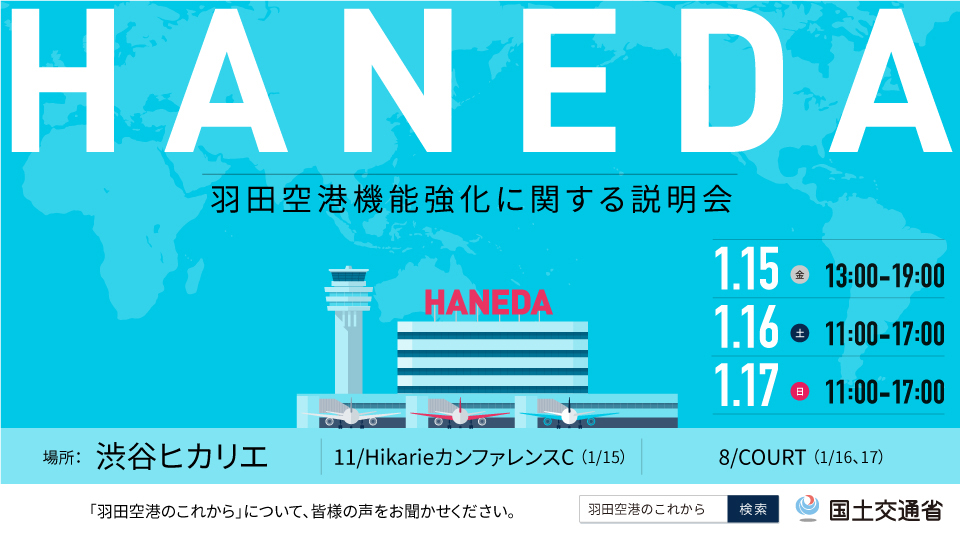 羽田空港の国際線を増便するための方策について、説明会を開催します。「羽田空港のこれから」について、皆様の声をお聞かせください。