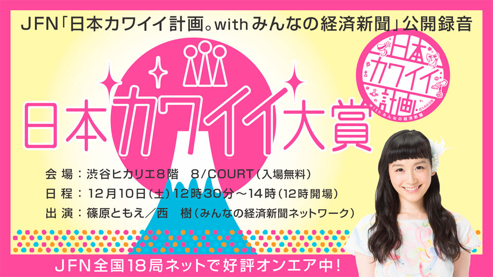 「地方創生2020」をテーマに篠原ともえがメインパーソナリティーを務めるJFNの番組「日本カワイイ計画。withみんなの経済新聞」(全国18局ネット)。イベントでは、これまで番組でご紹介してきた全国の「カワイイ」アイテムの中から「大賞」のほか各賞を決定します。