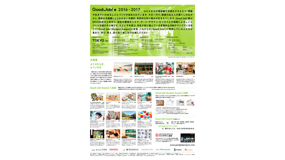 はたらき方の価値観が多様化するなかで、尊厳や生きがいのあるしごとづくりが求められています。その一方で、障害のある人の暮らしのなかから、既成の労働観にとらわれない先駆的・革新的な取り組みが生まれています。Good Job! 展は2012年度から始まり、福祉の領域をこえて、アート・デザイン・ビジネスとの協働によるしごとづくりを紹介する場です。さらに今年度は、学生が取り組んでいる実験的な活動やアイデアに注目した「Good Job! Student Award」も実施。これからの「Good Job!」に挑戦している人たちが集まり、学び、考え、語りあう場にぜひお越しください。
