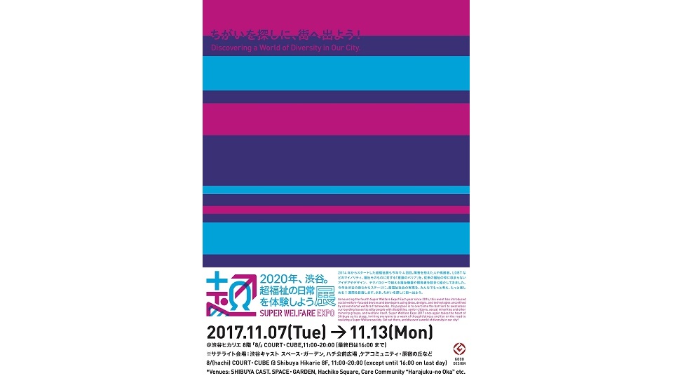 Announcing the fourth Super Welfare Expo! Each year since 2014, this event has introduced social welfare-focused devices and developers using ideas, designs, and technologies unconfined by conventional welfare frameworks. Its purpose is to overcome the barriers to awareness surrounding issues faced by people with disabilities, senior citizens, sexual minorities and other minority groups, and welfare itself. Super Welfare Expo 2017 once again takes the heart of Shibuya as its stage, inviting everyone to a week of thoughtfulness and fun on the road to realizing a Super Welfare society. Get out there, and discover a world of diversity in our city!
