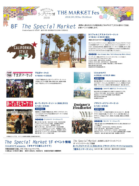 渋谷ヒカリエ開業6周年「シブピカ博2018 THE MARKET Fes」 会 期 2018年4月19日(木) - 2018年5月 6日(日) 時 間 11:00 - 20:00(初日は12:00から) 場 所 COURT (ヒカリエ8階) 料 金 入場無料 事前申込 不要 主 催 渋谷ヒカリエ お問い合わせ:info@hikarie.jp 開業6周年記念「シブピカ博2018 THE MARKET Fes」開催。話題性の高い「MARKET」、ワークショップ体験をお楽しみください。 渋谷ヒカリエは、開業6周年を迎え、「シブピカ博2018」を開催します。 シブピカ博とは、さまざまな切り口で、渋谷の過去・今・未来を見つめ、編集し、楽しんでもらうことで新しい渋谷文化を”ピカリと照らす”、年に一度の“渋谷ヒカリエ博覧会”です。 今年のプロモーションテーマは、「THE MARKET Fes」 渋谷ヒカリエがセレクトした“日本初出店” “関東初出店” “渋谷初出店”など 話題性の高い「MARKET」が集結します。 物販の販売だけでなく、ワークショップ体験などもお楽しみいただけます。 (↓画像クリックでPDFが開きます)