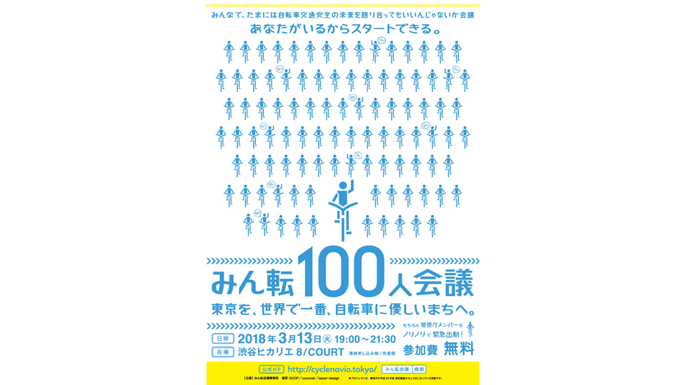 今回の『みん転100人会議』では、自転車交通に新しい価値観・可能性を見出している4名のゲストをお招きし、みんなと一緒になって“東京を、世界で一番、自転車に優しいまち”としてのビジョンを描き、どんなことが必要か、意見を交わしながらさまざまなアクションにつなげていきたいと思っています。
