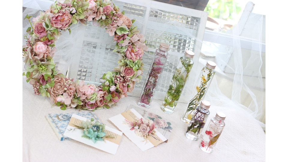 空間の中でハーバリウム作りなどのワークショップを体験頂けます