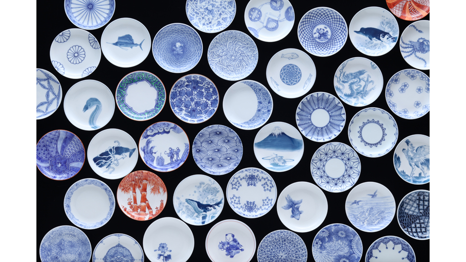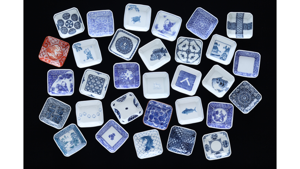 丸皿、角皿そして新たな十角皿。すべて手描きでによる、唐子や宝尽くしの古典文様から、人気の鯨など、すべて手描きによる多種多彩な豆皿が並びます。