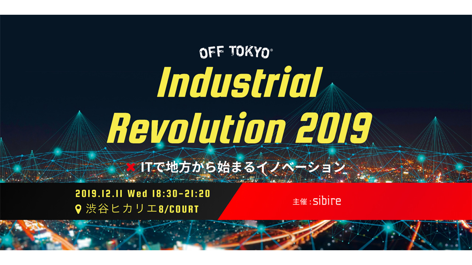 Industrial Revolution 2019×ITで地方から始まるイノベーション 会 期 2019年12月11日(水) 時 間 18:30 - 21:20 場 所 渋谷ヒカリエ8/COURT 料 金 無料 定 員 50名 事前申込 要↓こちらのイベントページからお申込みくださいhttps://lp.sibire.co.jp/offtokyo/industrial_revolution_2019 主 催 シビレ株式会社 いま地方では、その土地の産業や文化、歴史にテクノロジーの力が加わることで新しい改革が始まっています。 ただのIT産業なら、情報最先端の東京が強いかもしれません。 しかし、エリアごとに大きく特色の違うエリアの課題解決のための「IT活用」は、地方のほうが最先端を走っています。 これからの日本の未来をつくっていく「産業×IT」の最新事例を知り、参加者自身のアイデアを自由に発言いただき、地方から始まるイノベーションを体感するイベントです。