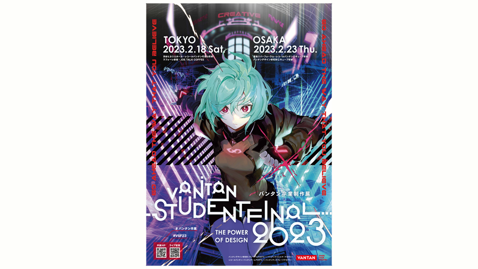 バンタン卒業制作展 VANTAN STUDENT FINAL 2023 会 期 2023年2月18日(土) 時 間 10:30 - 18:00 場 所 渋谷ヒカリエ8/COURT 料 金 入場無料/来場予約の上お越しください 定 員 なし 事前申込 不要 主 催 ㈱バンタン TEL: 03-5704-2111 バンタン各スクールで学んできたメンバーたちの集大成である「VANTAN STUDENT FINAL -バンタン卒業制作展」。 各分野のメンバーたちが、これまでに培ってきた感性、知識、技術、経験・・・ その全てをありったけの情熱を持って表現します。 軌跡を辿るそのステージは、これまで関わった多くの人たちに“驚き”と“感動”を刻み込みます。 ※イベントホームページ www.vantan.co.jp/studentfinal/