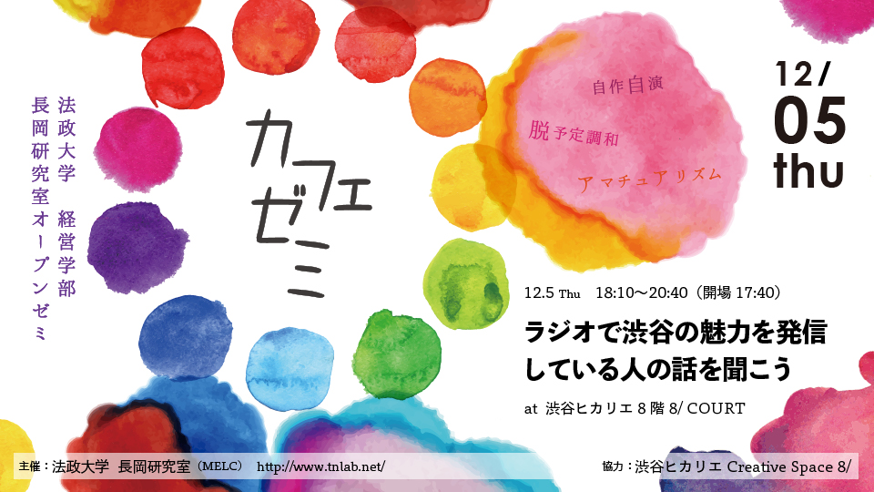 今回のカフェゼミでは、西さんから、渋谷という街の魅力、特に、渋谷で活動する人々のつながりについてお話を聞きたいと思います。また、街の人々をつなげるメディアとしてのコミュニティ・ラジオの魅力についても、お話を聞く予定です。師走の夜、渋谷に集い、美味しいお菓子とお茶を味わいながら、街とラジオとコミュニティについて、マジメに楽しく語り合いましょう。