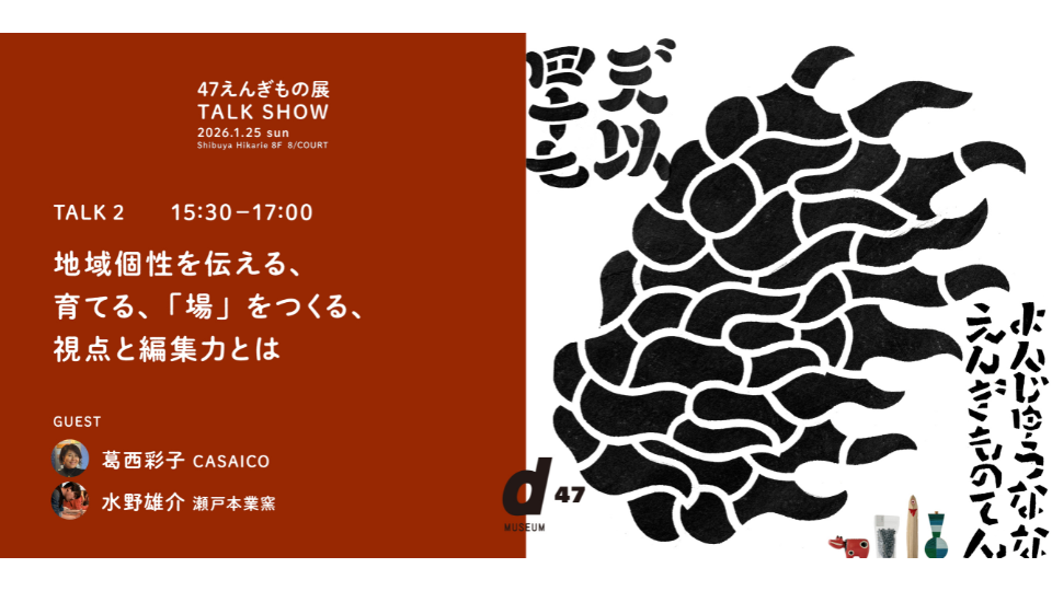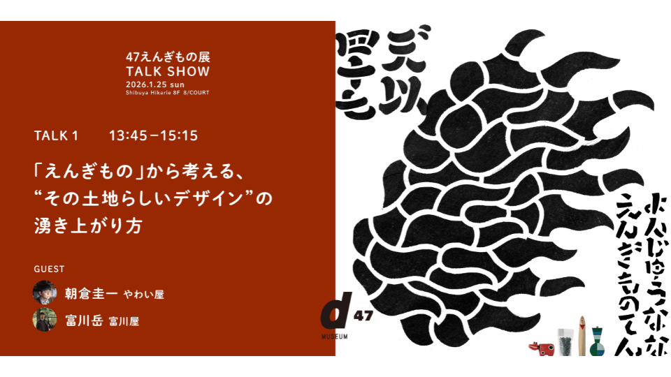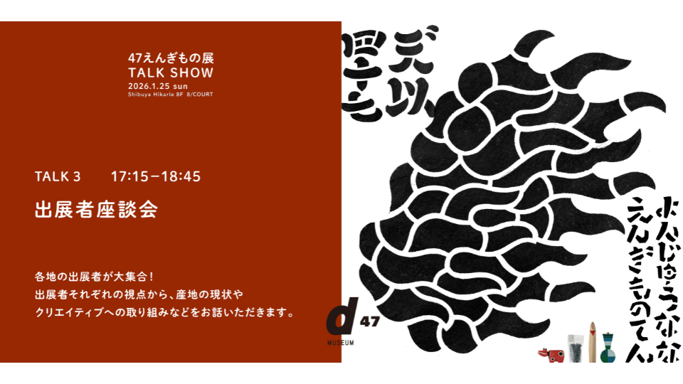 d47 MUSEUM 第37回企画展「47えんぎもの展」は、47都道府県の縁起物と、そのつくり手を通じて、47都道府県の個性を感じていただく展覧会です。その土地の風土や暮らしから生まれ、代々受け継がれてきた縁起物には、地域の風習やつくり手のものづくりの姿勢が色濃くあらわれています。本イベントでは、各地の実践者による具体的な取り組みや視点から、その土地らしいものづくりを未来につなぐヒントを探ります。