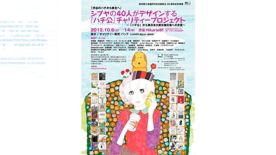 東京商工会議所渋谷支部は今年、支部設立40周年を迎えます。その記念事業として、多彩な才能が集い、新たな文化を発信し続ける街・渋谷ならではの東日本大震災被災地の復興支援として「『ハチ公』チャリティープロジェクト」を実施しております。プロジェクトでは、代官山生まれのトートバッグ専門ブランド「ROOTOTE(ルートート)」とのコラボレーションで、渋谷にゆかりのある40人のクリエイターによる「忠犬ハチ公」がモチーフのアートワークをのせたチャリティートートバッグを今秋より発売。その収益を東日本大震災被災地への支援活動に役立ててまいります。