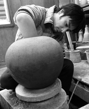 ろくろ成形。電動ろくろにより陶器の形を作る。