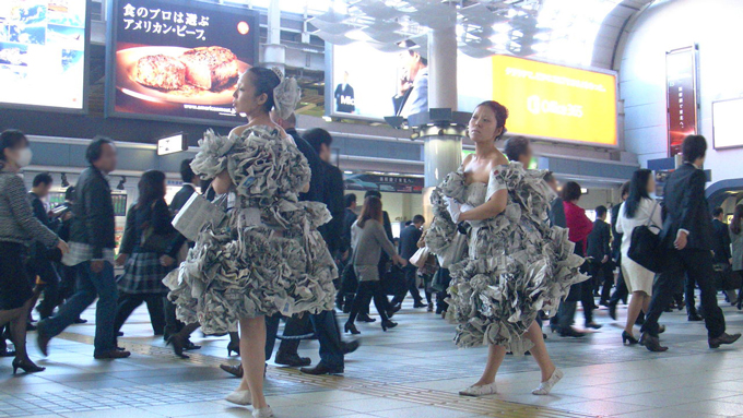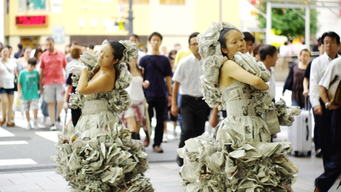 代表作は、新聞紙のドレスを着て街中を練り歩く作品です。日常の中に見慣れない・想定していなかったもの(=新聞紙のドレスを着た2人)を突如出現させることで、日常や置かれた環境が新たな視点で見えてくる、といった作品です。その様子を客観的に捉えると、パフォーマンスをしている2人が主役なのではなく、それを見ている人々の豊かな表情や動き(もしくはそれらの欠如)の方が「主役」であると気づきます。そうしてできた空間を、一つの「作品」としています。