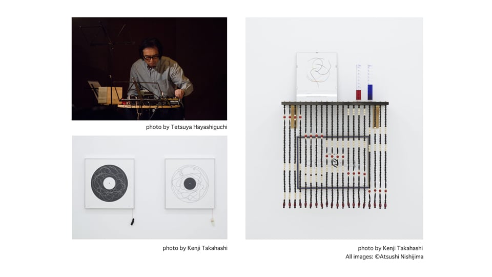 ニシジマ・アツシは1965年京都生まれ。1989年大阪芸術大学音楽学科を卒業後、岐阜県立国際情報科学芸術アカデミー(IAMAS)を修了。2001年アジアン・カルチュラル・カウンシルの助成によりニューヨークに滞在し、2014〜2015年には文化庁新進芸術家海外研修制度によりベルリンに滞在。現在は京都を拠点に制作しています。「Citycircus」(New Museum of Contemporary Art、ニューヨーク、1994 年)、「足りないOのために“KYTO”」(小山登美夫ギャラリー京都、2011年)など国内外の展覧会に多数出展する他、2007年から2012年まで継続的に開催されたジョン・ケージ生誕100周年記念コンサート「John Cage Countdown Event」(国立国際美術館、大阪ほか http://www.jcce2007-2012.org)を主宰するなど、精力的に活動を続けており、これまでに小杉武久、高橋悠治、高橋アキ、カール・ストーン、竹村延和、HACO、ヤマタカEYE等と共演しています。2017年6月から8月に開催されたコペンハーゲンでのグループ展「Japanese Connections」(ニコライ・アートセンター)にも参加しました。