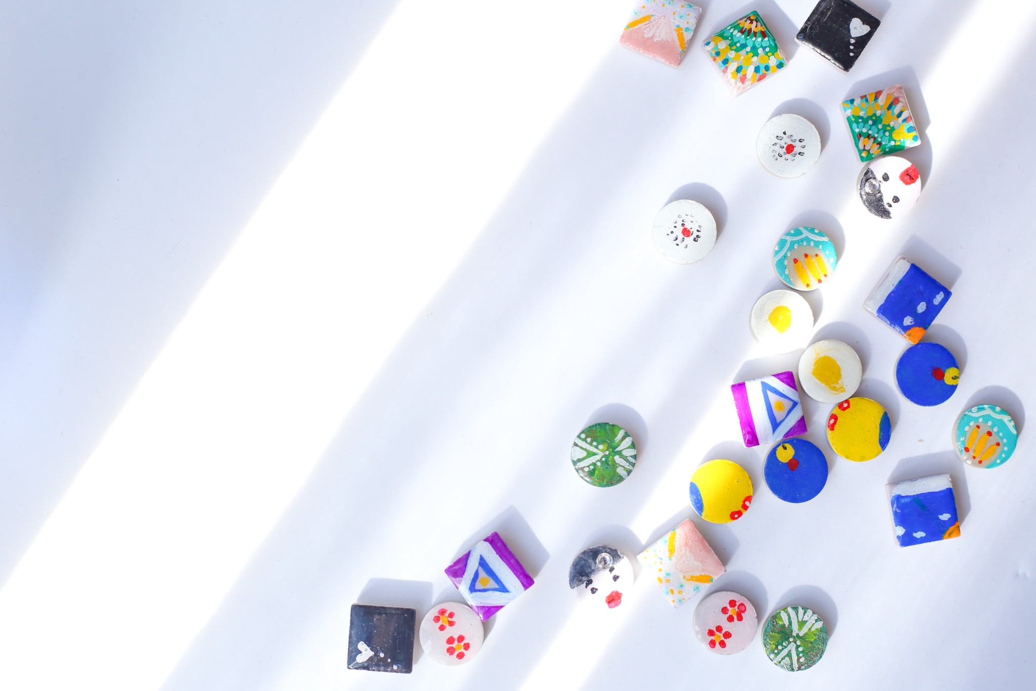 その場でご希望のタイルを選んでいただき、その上にご自身で絵付けをしていただきます。(釉薬ではなく、気軽に楽しんでいただけるよう、マニキュアやアクリル絵具を使用していただきます。)それをそのままピアスまたはイヤリングにしてお渡しします!