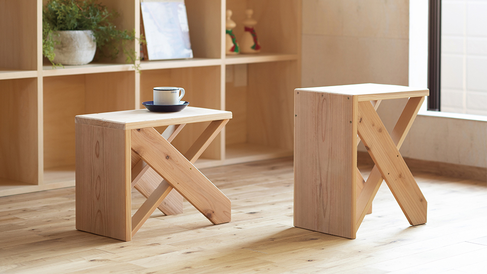 このスツールのデザインで印象的なのは、側面のクロスした部材の箇所。この板が、筋交いの役割を担い、横揺れにも強い構造に考えられています。縦に置いても、横に置いても見た目の違和感がなく、細部の木材のカットの仕方まで、KAKデザイングループの細やかなデザインへの気遣いが凝縮されたスツールです。