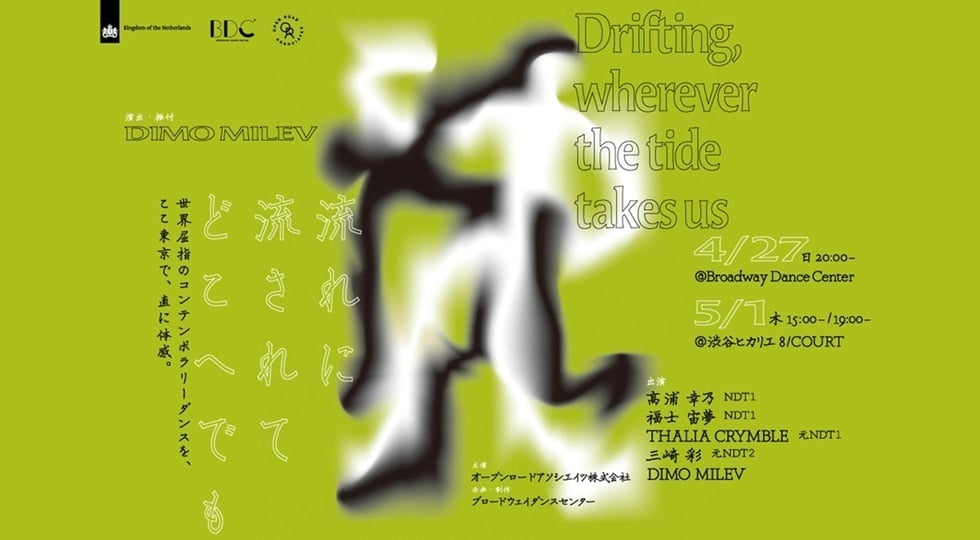 世界のコンテンポラリーダンスの第一線で活躍する髙浦幸乃(NDT1所属)、福士宙夢(NDT1所属)、タリア・クリンブル(元NDT1)、三崎彩(元NDT2)が共演し、NDTをはじめ世界的なダンスカンパニーに作品を提供している新進気鋭の振付家ディモ・ミレフによる新作「流れに流されてどこへでも」をワールドプレミアとして披露します。