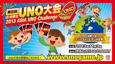 01 COURT 小・中学生UNO大会&UNOアジアチャンピオン決定戦 UNO Asia Challenge 2013 Grand Finale アジア8か国のUNO大会を勝ち抜いた小・中学生が東京に集結! 栄えある初代UNOアジアチャンピオンを目指した熱い戦いが始まる! We will held UNO Asia Challenge 2013 Grand Finale on 3rd November. 8 co