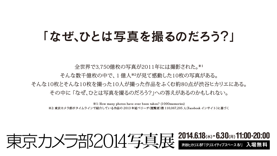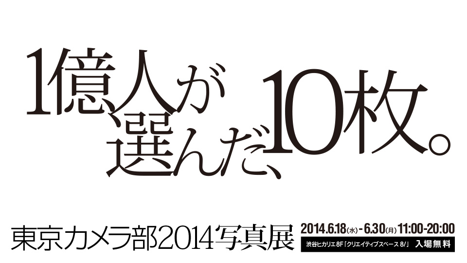 2013年に東京カメラ部とその分室に投稿いただいた約10万作品の中から延べ1億人が見て選んだ10作品「10選2013」。いわば「1億人が選んだ、10枚。」を中心とした約80作品を展示する予定の合同個展です。本写真展では、「1億人が選んだ、10枚。」に加えて、その10枚を撮影した10選2013メンバーが撮った新作、自信作、10選2012メンバーの作品、そして2,000を超える作品の中から20作品のみが選ばれた東京カメラ部2014写真コンテスト入賞作品を展示いたします。