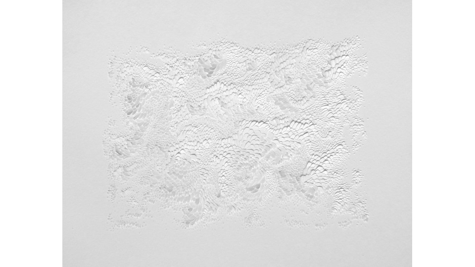 フリーハンドでデッサンを描くようにメスを使い、水彩用紙を切り込んでいく独自の技法で、緻密で繊細なbas-relief (浅浮き彫り)のシリーズを制作しています。切り込まれた縁に陰影がうまれ、光の角度によって動きのある有機的なモチーフが浮かびあがります。